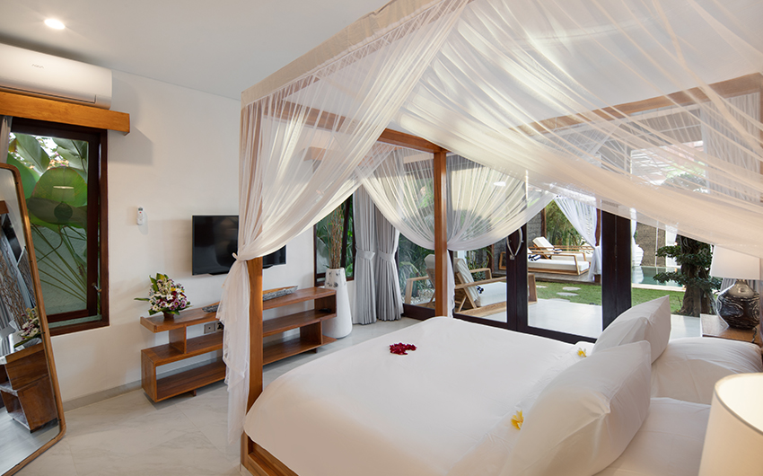 This elegant modern bedroom is designed with teak wood furniture, creating sophistication and warmth. Its tranquil ambiance is complemented by a relaxing view of the pool